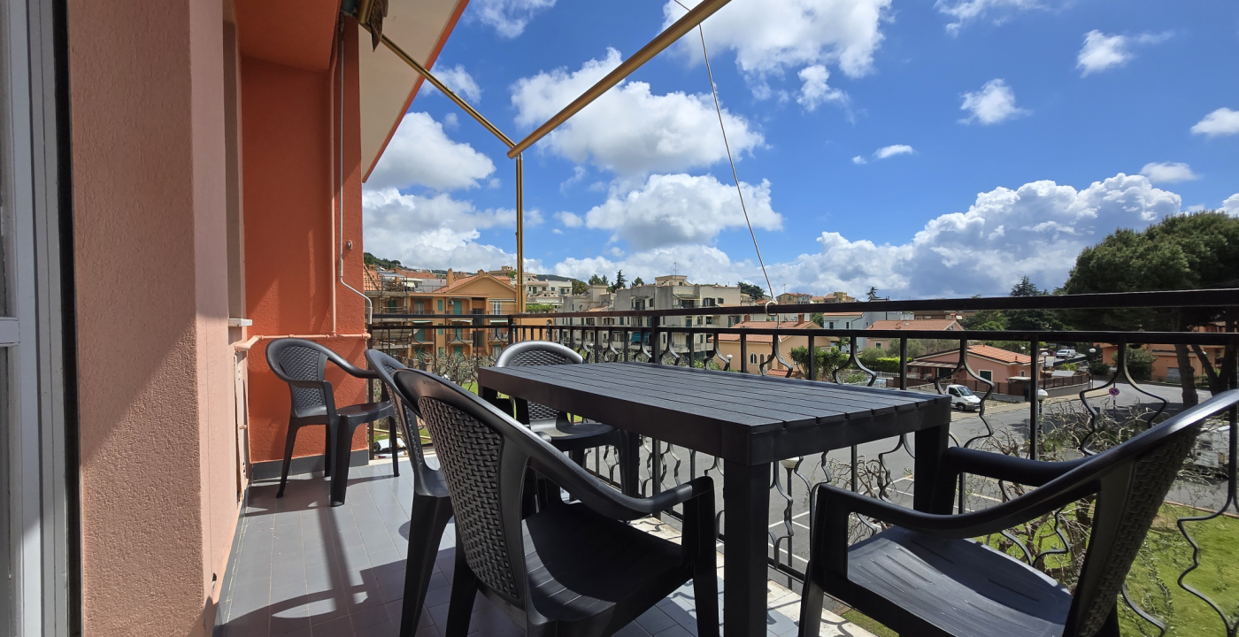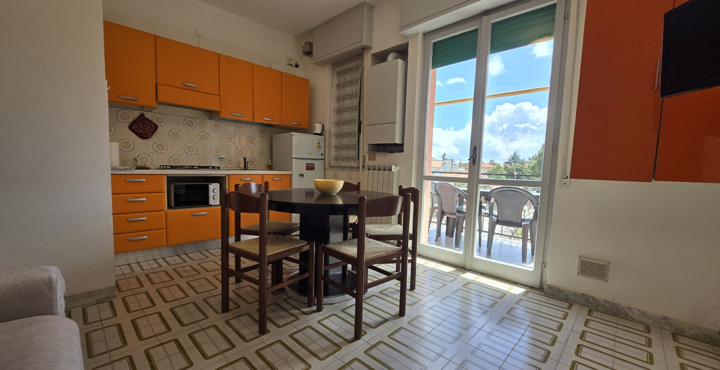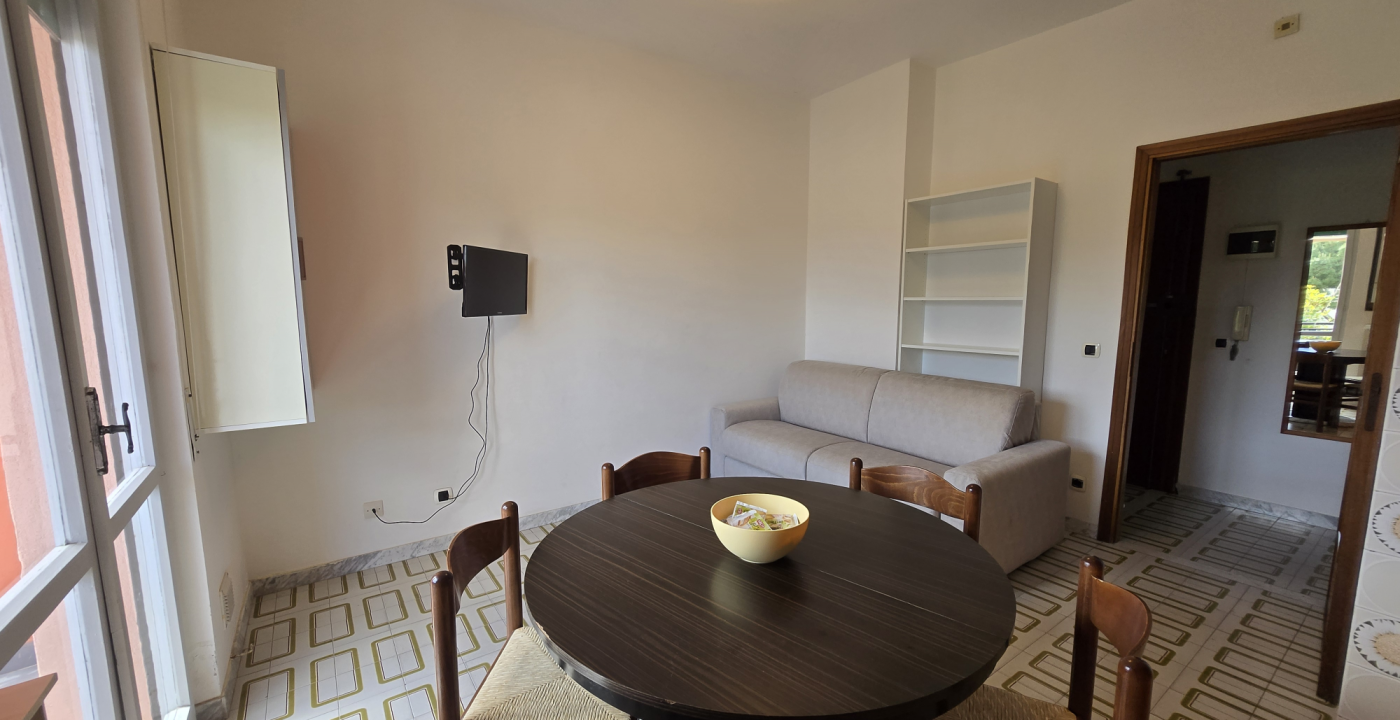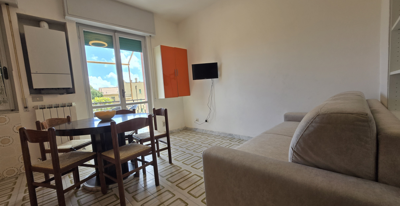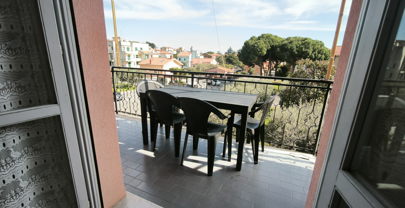 La zona giorno è ampia e accogliente, con un divano letto matrimoniale, una tv e un tavolo per 5 ospiti. La cucina è completamente attrezzata e ha accesso diretto a un balcone arredato con tavolo e sedie, ideale per un pasto all’aperto.